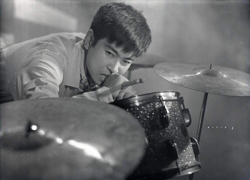 銀座にあるジャズ喫茶「ブルースカイ」のNo.1ドラマーとして人気絶頂の桜田。彼を育てた敏腕マネージャー・美弥子の元に、英次という青年が訪ねてくる。英次は兄の正一をドラマーとして売り込みに来たのだった。天狗になっている桜田は最近では美弥子の指示もきかず、仕事も拒否してダンサーと出掛けてしまうなど調子に乗った言動が目に余る。そんな桜田に困っていた美弥子は、渡りに船と正一に会ってみることにした。喧嘩っ早い正一は留置所にいたが、美弥子に連れ出されると早速ドラムを叩いた。粗削りだが稲妻のような正一の演奏に美弥子ははっとし、正ドラマーとして契約することを決めた。正一は「やくざな息子」と冷たい態度をとる母を見返すため、火の出るような猛練習を始めた。美弥子の厳格な指導もあり、正一の腕はみるみる上がっていった。その演奏はまるで「台風のかたまり」のようだった。やがて正式なバンドのドラマーとしてデビューした正一は桜田とのドラム合戦に挑むこととなる。